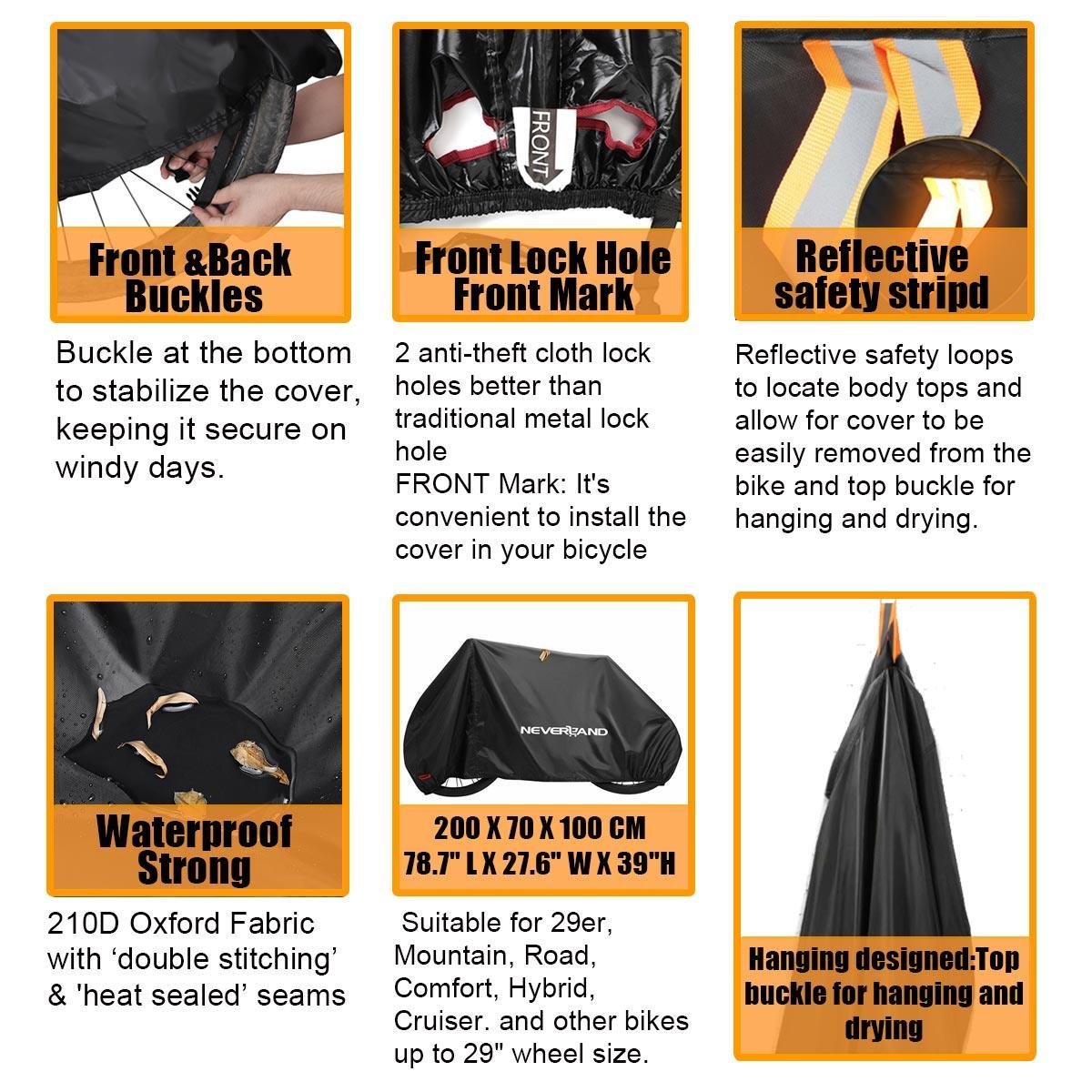if left outside without a cover, your bicycle will rapidly undergo corrosion and rust. That’s why a quality bike cover is essential. NEVERLAND all weather bike cover ensures a reliable weather protection. In other words, your two-wheeled friend won’t be damaged by the sun, moisture, and dust. Plus, a bicycle cover can be used for comfortable indoor storage during winters and for convenient transportation.
