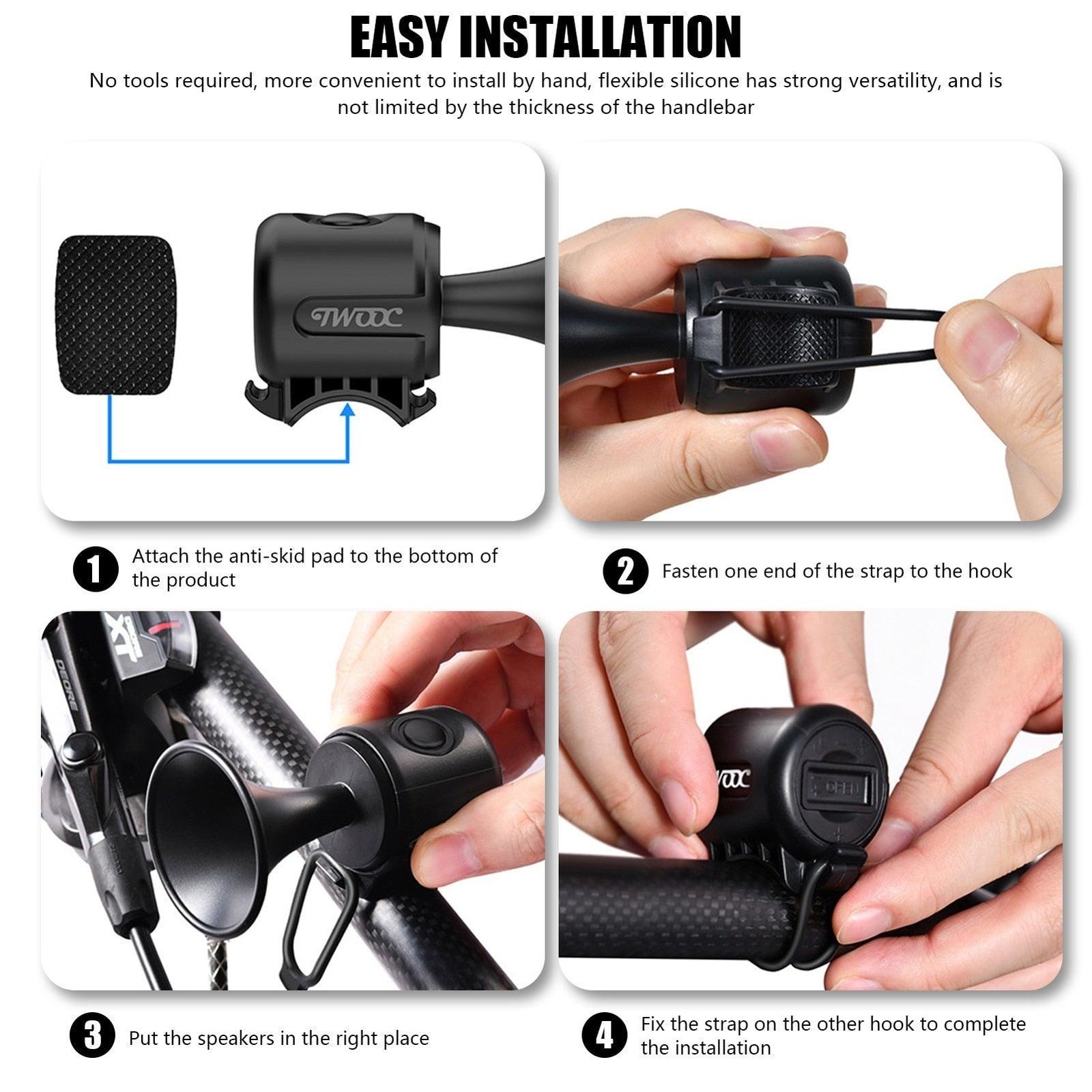 2、Easy to Install: The 120db Electric Bicycle Horn is very easy to install, no tools are needed. You can install or uninstall it on your bike handlebar in a few minutes.