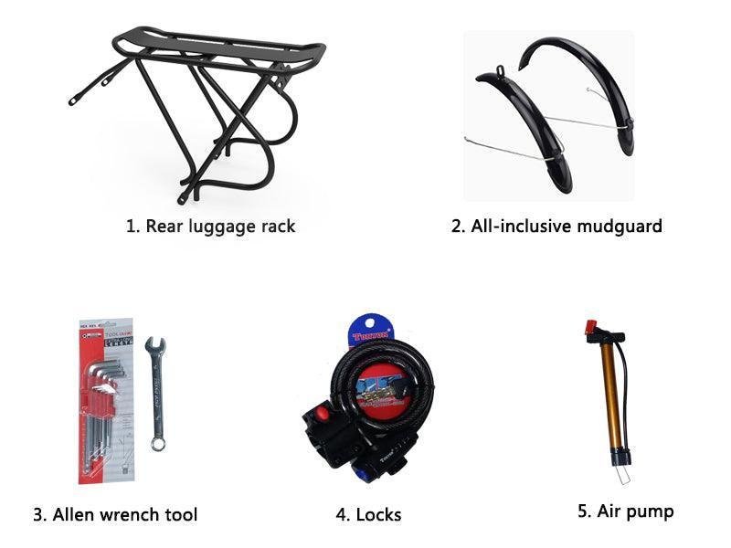 Optional imported Shimano 7-level transmission system, customized aluminum alloy crank 52T chainring, after the classic matching of the front 1 and the rear 7 gears, the sis positioning is durable and the 7th gear greatly enhances the riding pleasure.